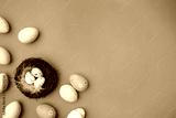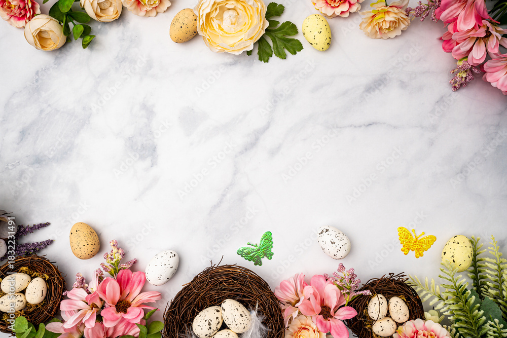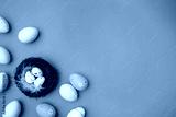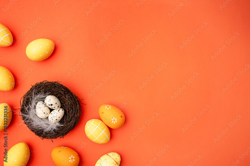 Happy Easter background with easter eggs in nest. Easter background with copy space. Flat lay. High quality photo with orange background