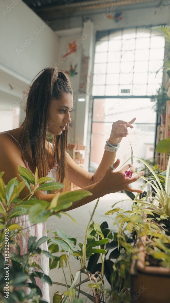 A Young Woman Devotedly Caring for Her Indoor Plants While Utilizing Natural Light