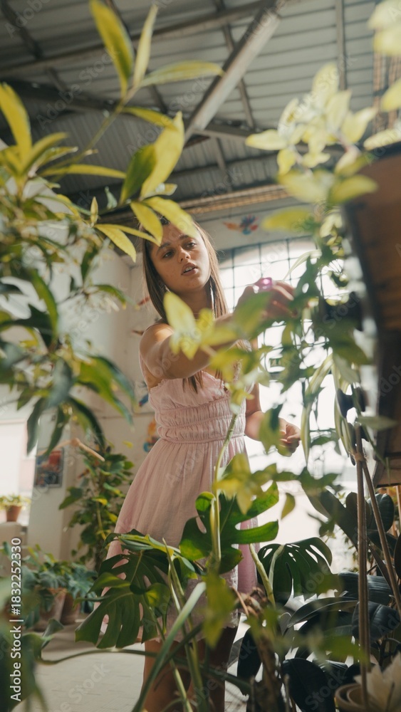 A woman is engaging with her indoor plants while surrounded by a refreshing green environment