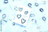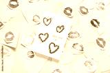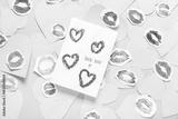 Composition with greeting card, pink paper hearts and lipstick kiss marks on grey background. Valentine's Day celebration