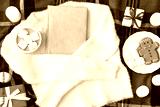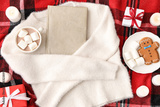 Composition with book, warm sweater, cup of cocoa drink and burning candles on red checkered plaid