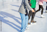 Close-up of skating lesson with woman and instructor on ice rink during sunny winter day. Concept of beginner ice skating and personal coaching session, fun and outdoor winter lifestyle