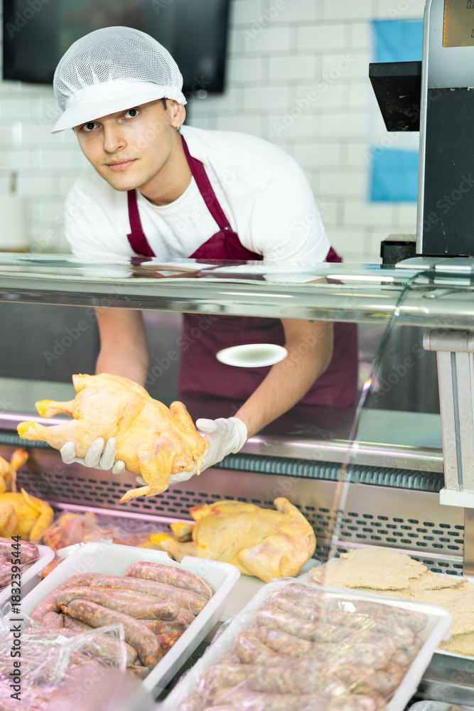 Male meat vendor provides selection of fresh, organic options at grocery store.
