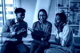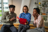 Coworkers celebrating surprise gift, feeling joy and happiness