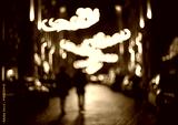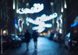Blurred city at night. Bokeh. Beautiful abstract background with defocused buildings, cars, city lights, people. Colorful bokeh background with urban night scene. Design. Concept backdrop. Vintage