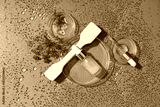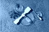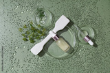 Composition with bottle of dill cosmetic product and Petri dishes in water on green background, closeup