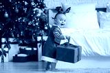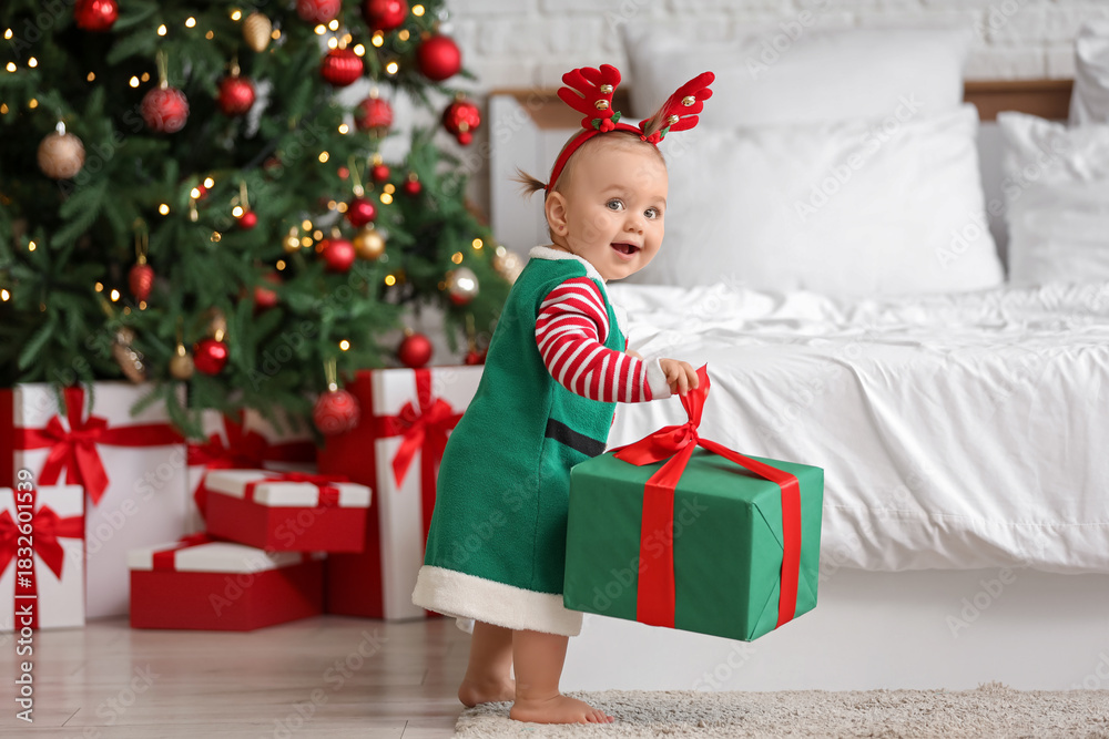 Cute little baby in elf costume and reindeer horns with gift box near Christmas tree in bedroom