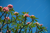 Tropical plumeria flowers blooming under blue sky. Pink frangipani blossoms on tree in sunlight. Exotic tropical plant with green leaves and flowers. Beautiful plumeria branches against clear sky.