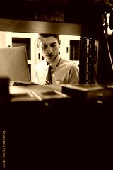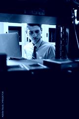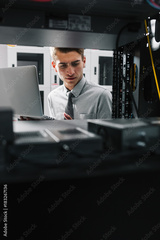Portrait of modern young man holding laptop standing in server room working with supercomputer
