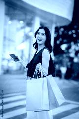 An Asian woman happily looking at her phone while carrying shopping bags outside a modern building, capturing the cheerful lifestyle of a young Asian girl enjoying her shopping day.