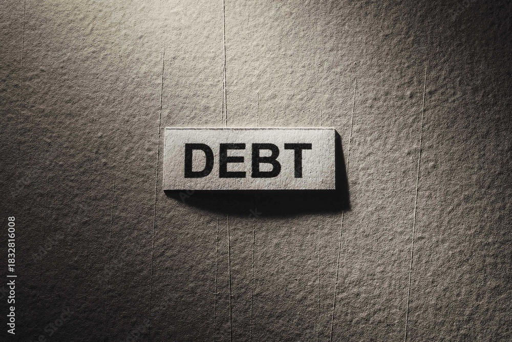 word “DEBT” on a textured paper surface with dramatic lighting. Dark shadows convey financial stress, economic burden, and money problems.