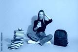 Young woman student phone smiling sits on floor stack of book backpack yellow background for education fashion lifestyle and shopping theme