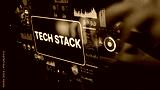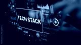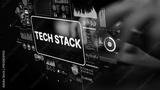 Hands typing on laptop keyboard with futuristic tech stack digital interface and data visualization elements in background. Asymptotic smart data analytic.