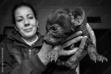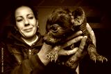 Spotted hyena puppy with a keeper in zoo. Little hyenas puppies in the captivity. Crocuta crocuta.