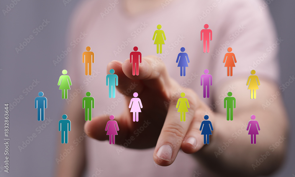 Abstract image showing a hand pointing at a network of digital figures representing people. Concept of connection, community, and social media.