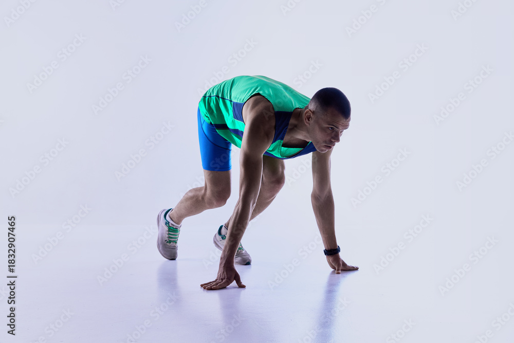 Runner leaning forward in sprint launch motion. Concept of sports ads, athlete motion studies, professional training materials, and dynamic visuals for fitness products.