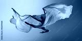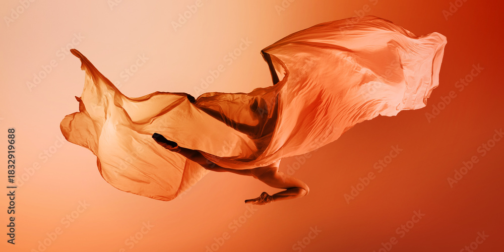Ballet dancer floating under large orange fabric wave on warm background. Concept of campaign visuals, airy dance moments, editorial movement photography.