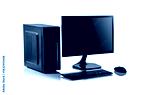 A black desktop computer setup, including a tower case, monitor, keyboard, and mouse, sits on a reflective white surface.