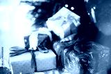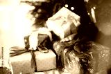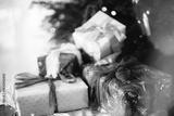 Stylish Christmas presents. Merry Christmas and Happy Holidays! Wrapped Christmas gift boxes against xmas tree with lights bokeh. Holiday banner, atmospheric winter time