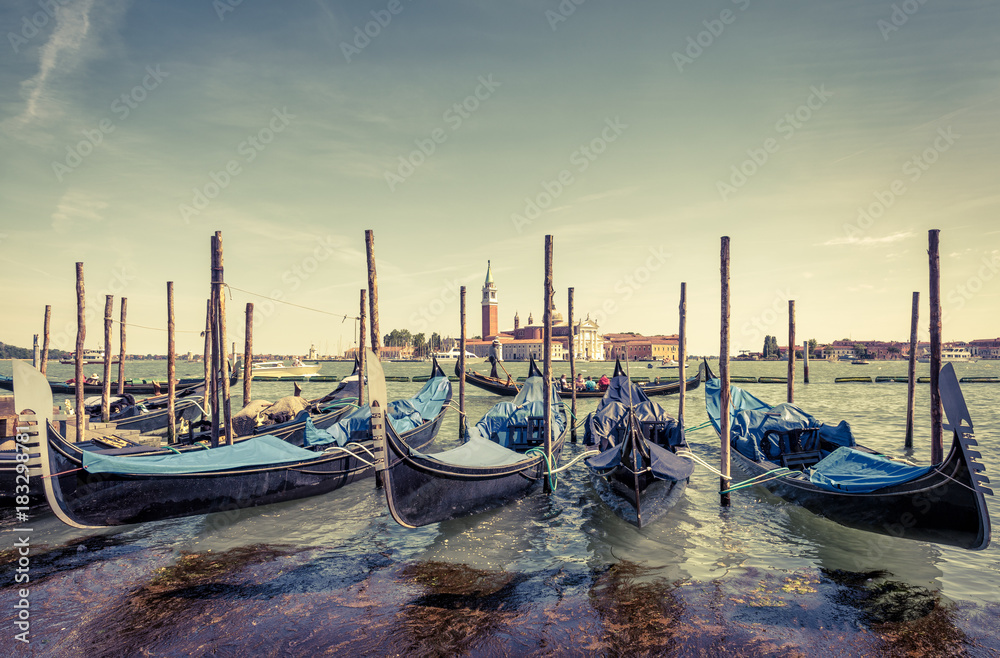 Panorama of parked gondolas in San Marco, Venice, Italy