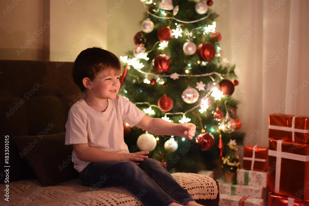 Happy boy hold burning sparkler and smiling In front of Christmas tree. Young boy holding burning sparkler. Winter, holiday, vacation, Christmas