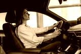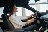 Driving, comfortable seat. Woman is sitting in the modern car, happy new owner
