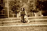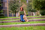 Confident middle-aged woman sitting outdoor in an autumn day and using notebook