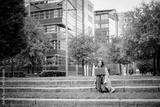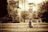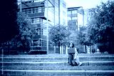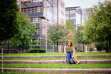 Confident middle-aged woman sitting outdoor in an autumn day and using notebook
