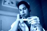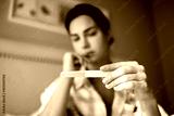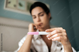 Woman holding a pregnancy test with a thoughtful expression, sitting in a softly lit bedroom, reflecting on potential life changes and future possibilities with copy space