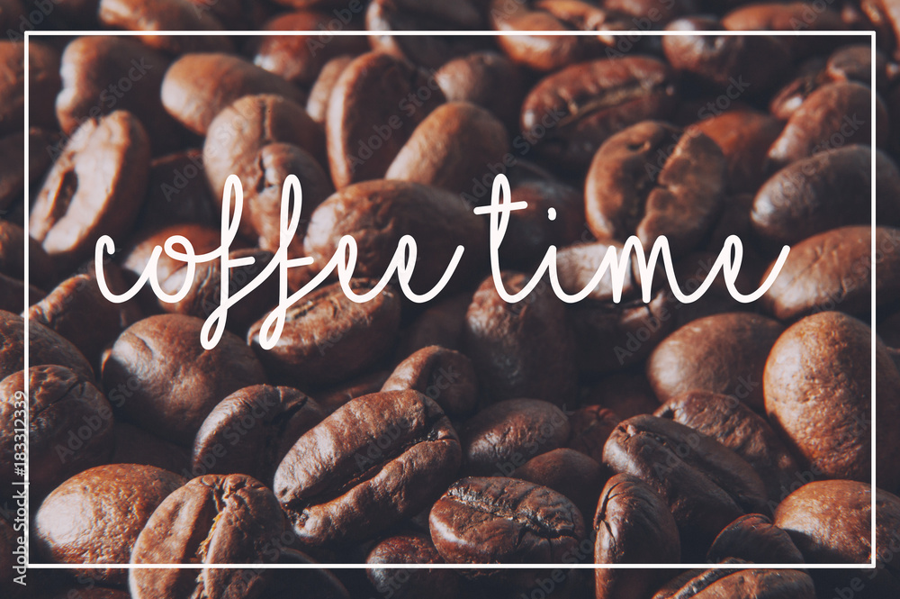 Coffee beans macro and text coffee time.