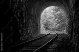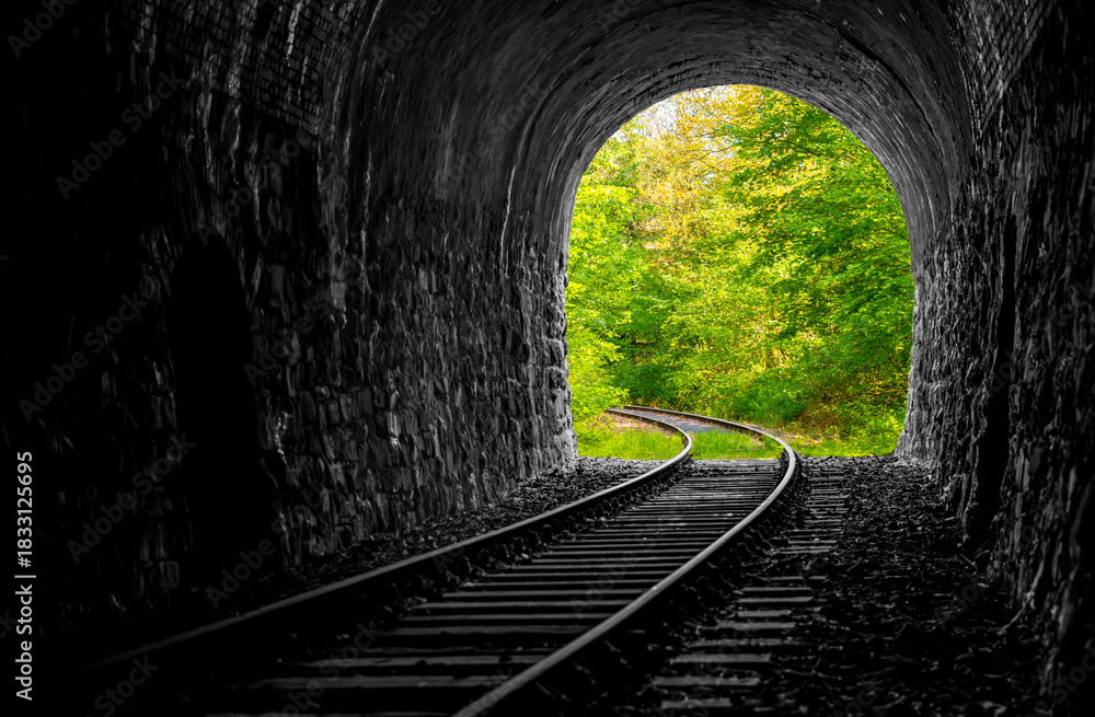Tunnel on a small branch line in the Sauerland region (Germany). View from the brick portal into the lush green countryside. Black-and-white photograph contrasting with colorful landscape motif.