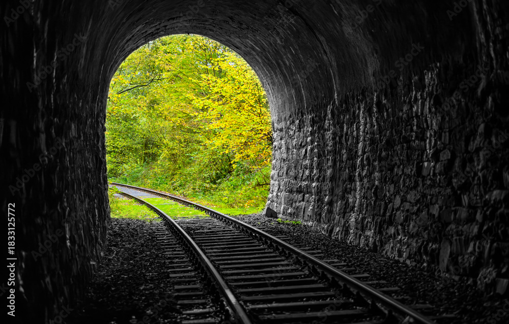 Tunnel on a small branch line in the Sauerland region (Germany). View from the brick portal into the lush green countryside. Black-and-white photograph contrasting with colorful landscape motif.