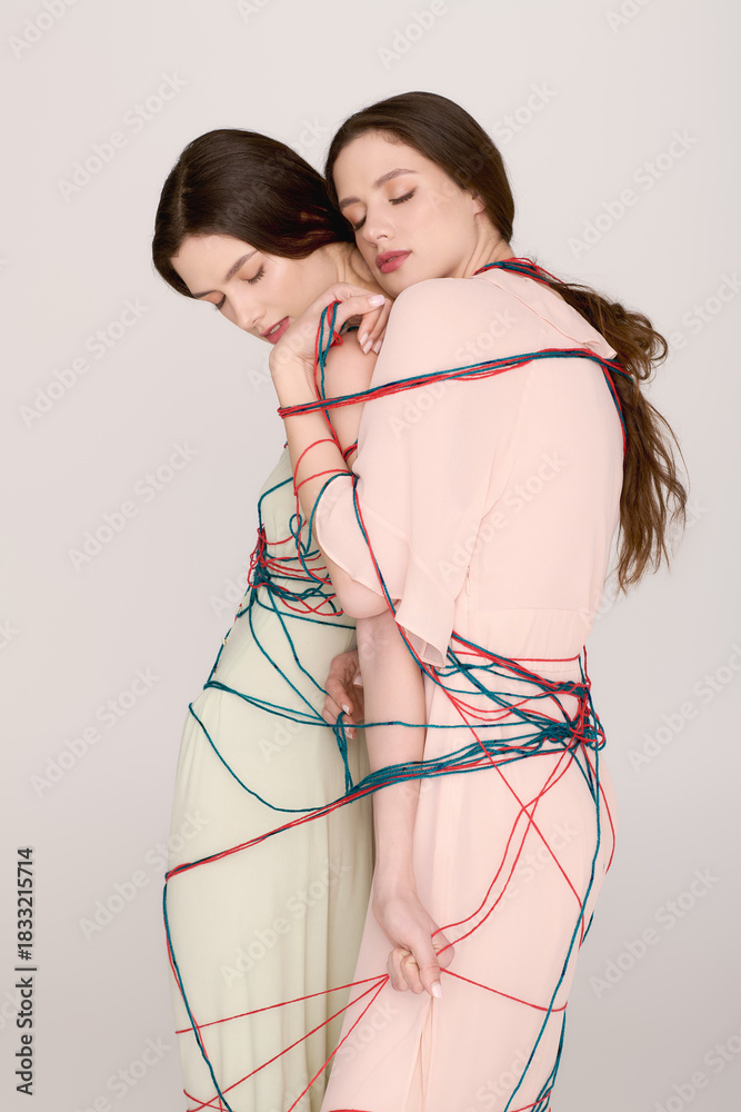Twin sisters elegantly wrapped in colorful threads showcase unique fashion artistry