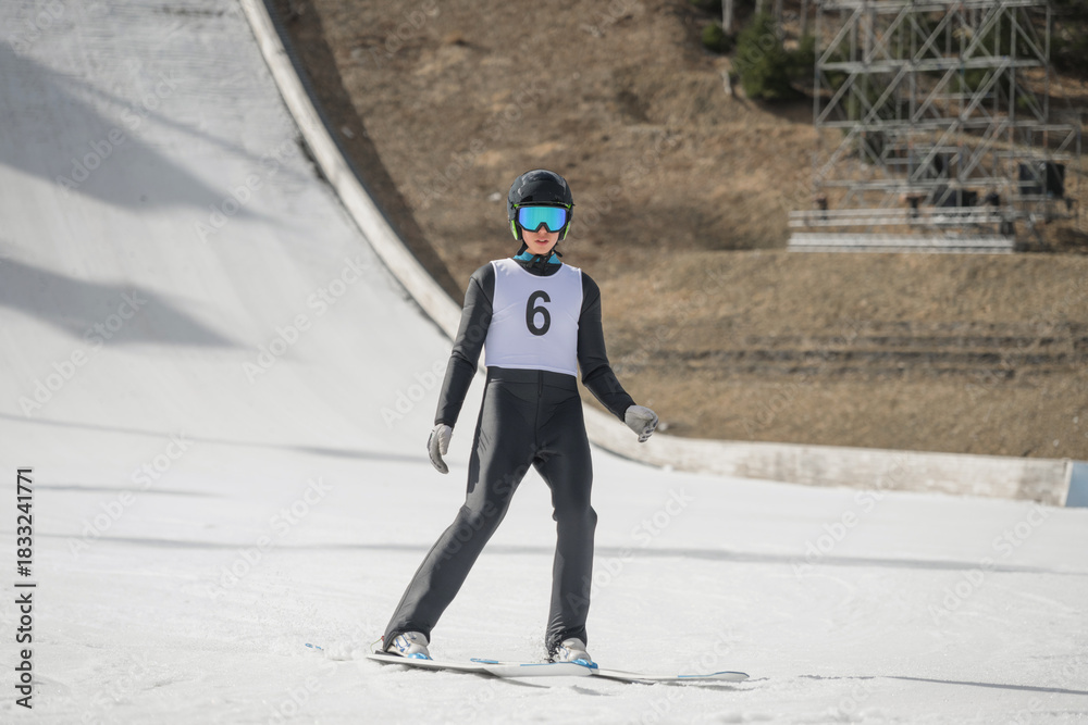 A young ski jumper lands from the ramp during a training session on a sunny winter day.