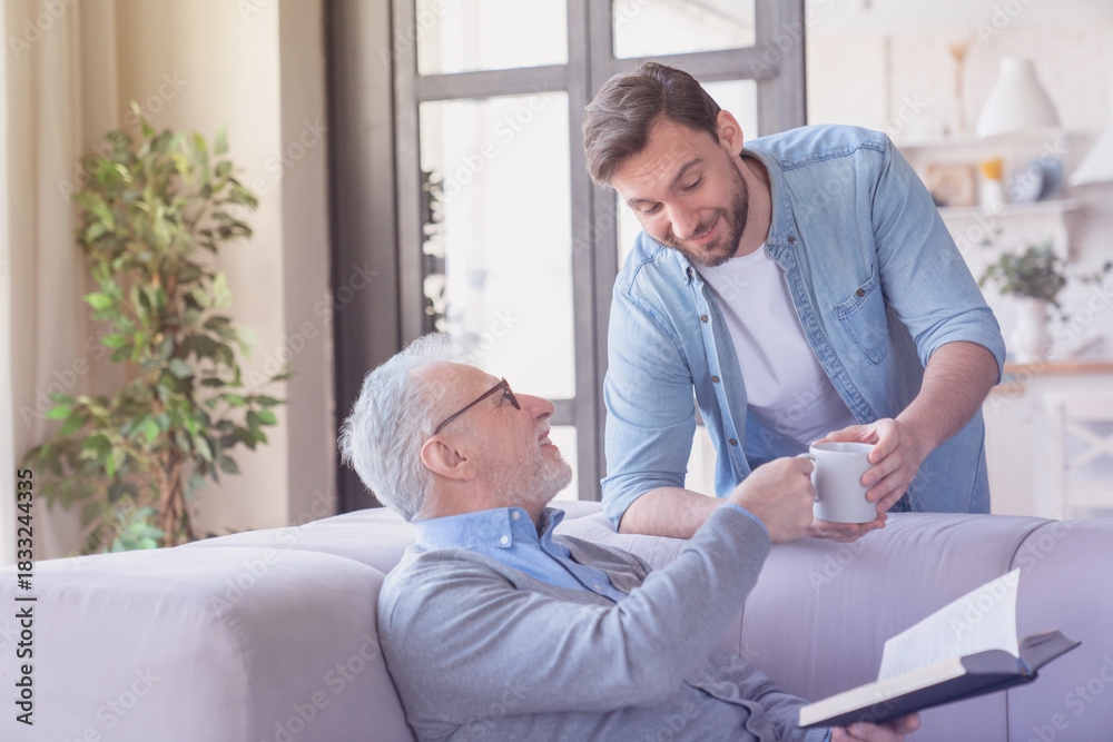Loving caring young adult son bringing give his old elderly senior father a cup of water hot drink at home indoors. Elderly generation support and help aid. Happy father`s day! I love you, dad!