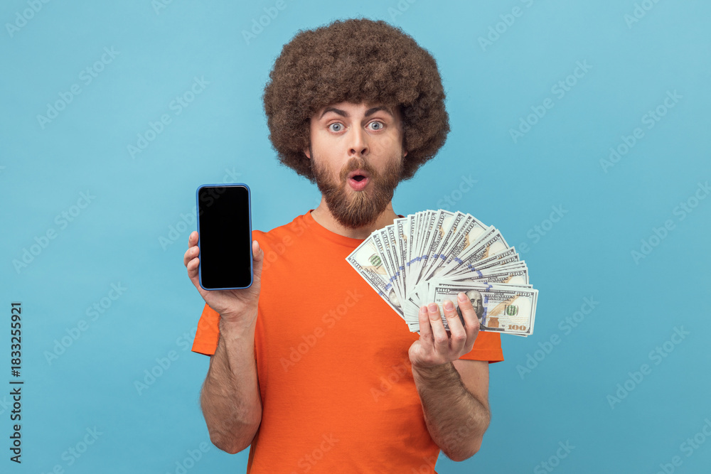 Man holding fan of banknotes and smart phone with empty screen for advertisement.