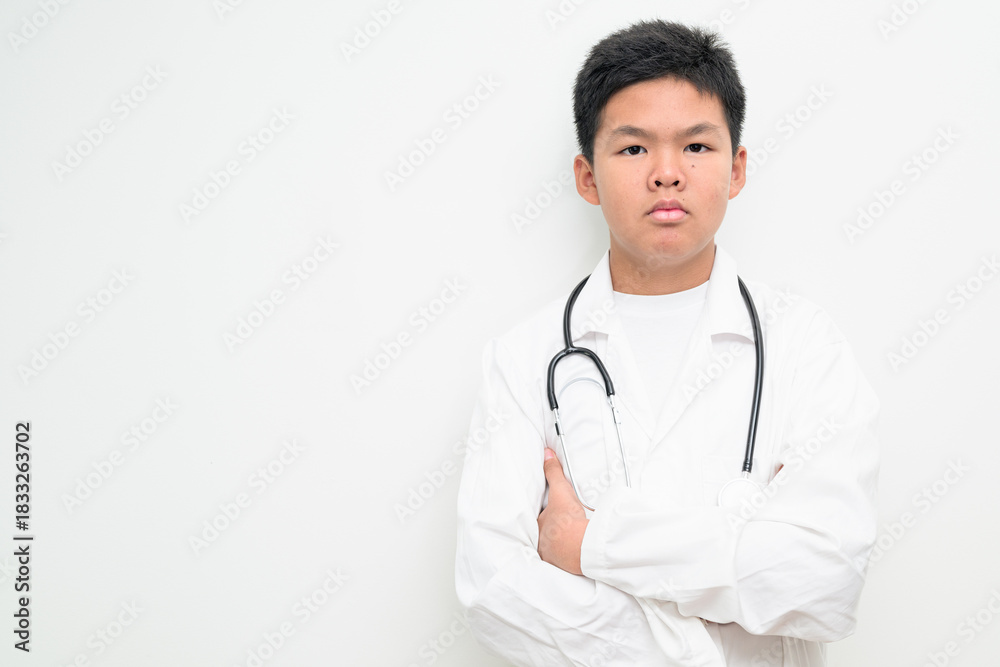 Young Asian Boy Dressed as Doctor with Stethoscope Arms Crossed