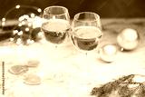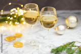 Glasses of white wine and Christmas decor on light marble table, closeup