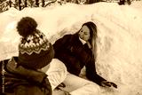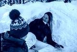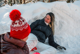Smiling woman lying on snow, chatting with child in a cozy red knitted hat, enjoying winter holidays together outdoors in a beautiful snowy landscape surrounded by trees