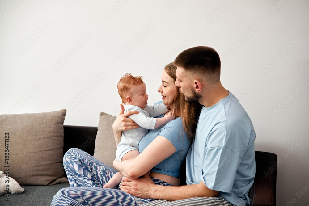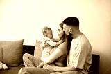 Family spending time together in a cozy living room with a baby on a sofa during the day