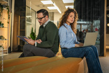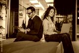 Business colleagues working back to back in office