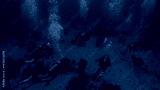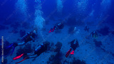 Scuba divers in the deep blue sea. Underwater photo from a scuba dive
