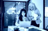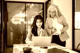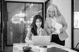 Old asian businesswoman standing holding pen and book looking at young coworker's laptop in office