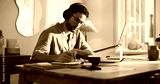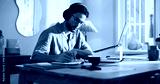 Man, journalist and writing with laptop in home for online story, article or remote work. Male person, freelancer or taking notes with book, headphones or computer for journalism or schedule diary
