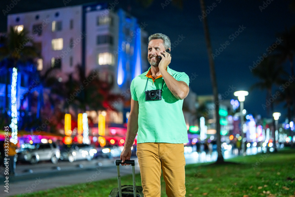 Man talk on phone in night street. Tourist calling on phone in night city. Hispanic guy using phone. Mature man talking on phone during travel. Urban traveler conversation on smartphone.