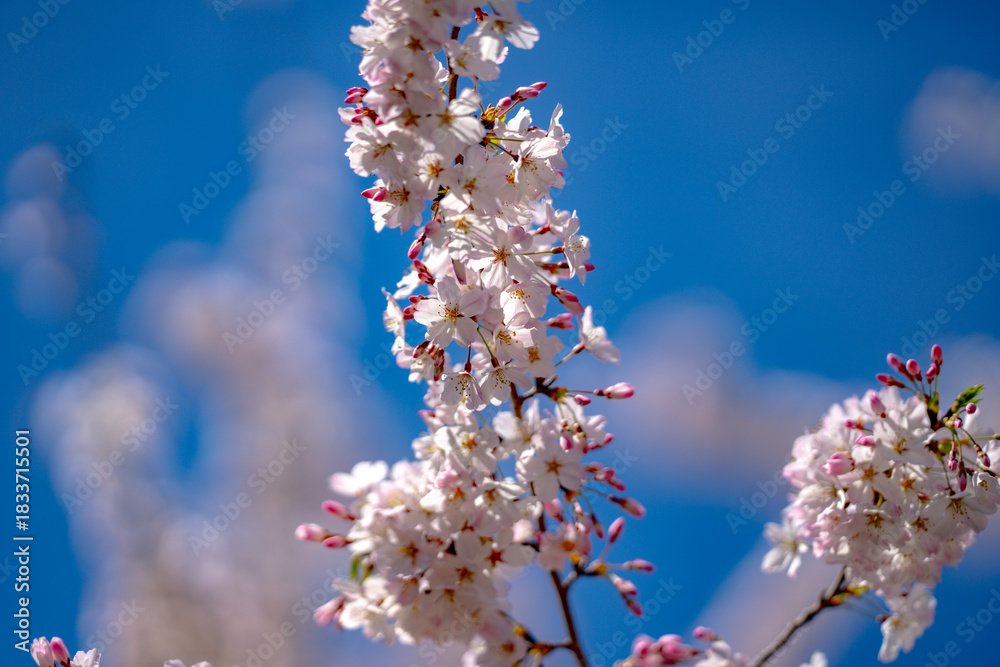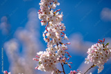 Bunches of plum blossom with white flowers against the blue sky. Spring blossom background. Blossoming apple tree branch on sky background. Spring flowering tree branch with white flowers.