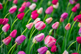 Blooming tulip field in spring season. Multicolored blossoms spring. Fresh tulip field in natural spring light. Vivid spring blossoms nature. Tulip meadow in natural landscape setting.