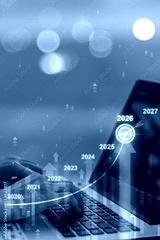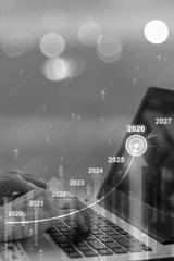 2025 to 2026 business financial plan market concept, performance of profit growth on 2026, education trend up finance on growth graph money revenue, Businesswoman analyzes profitability of working