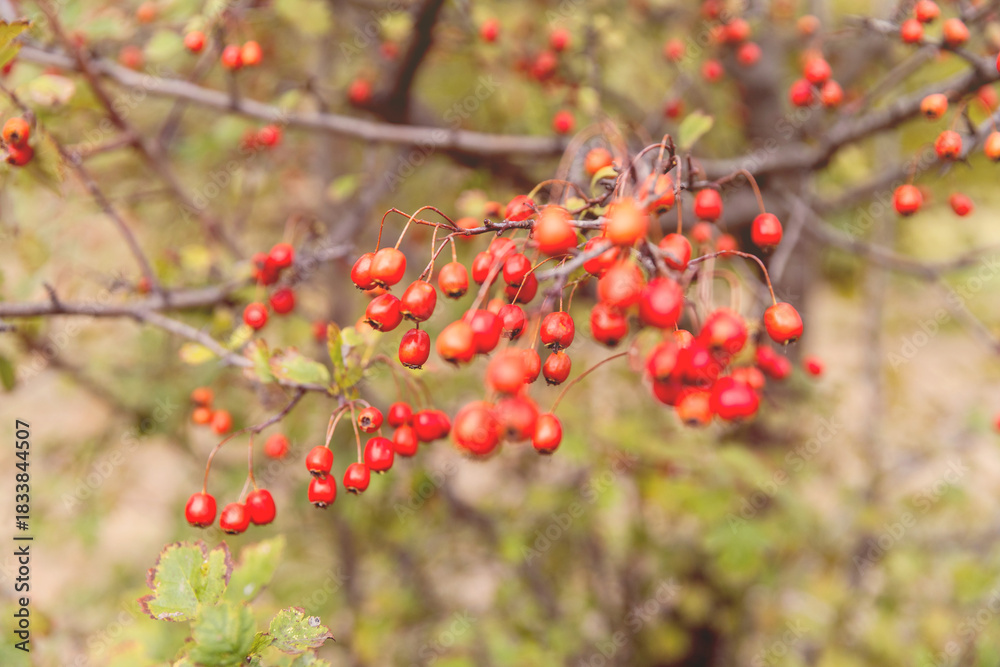 Bright red hawthorn berries hanging on branch in autumn with soft bokeh focus