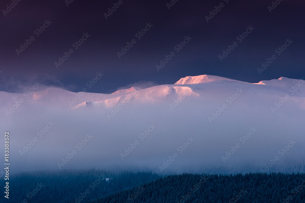 Fantastic landscape of winter mountains at sunrise. View of dramatic cloudy sky and snow-capped peaks in the distance.